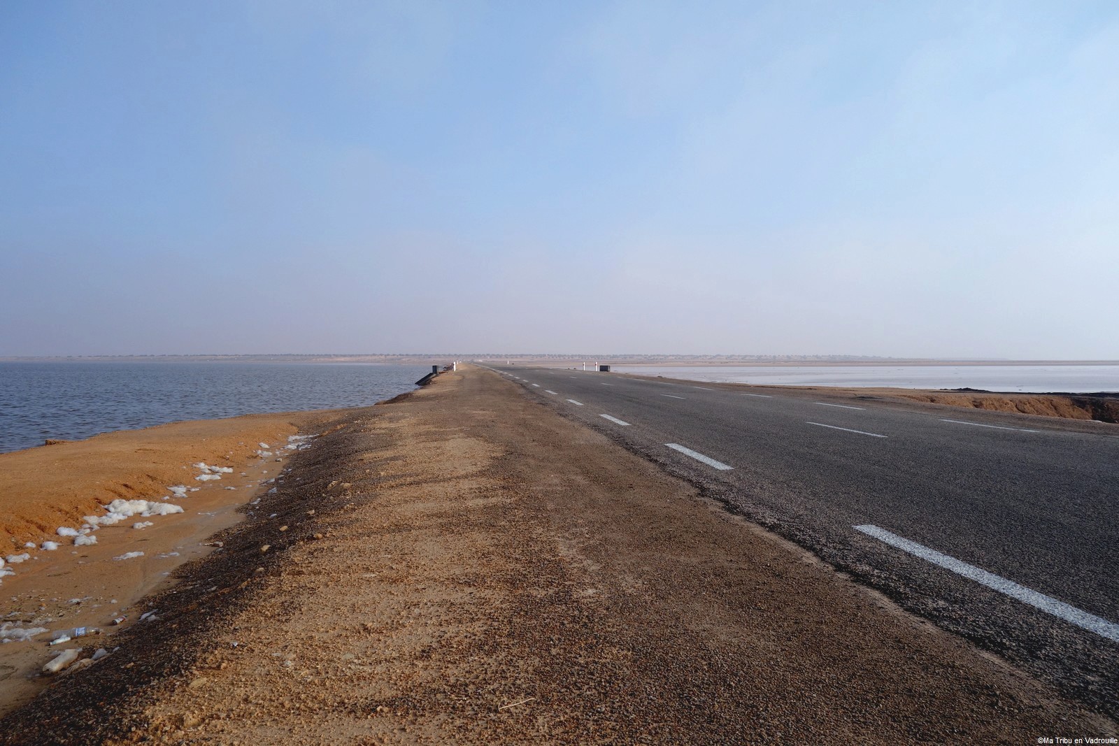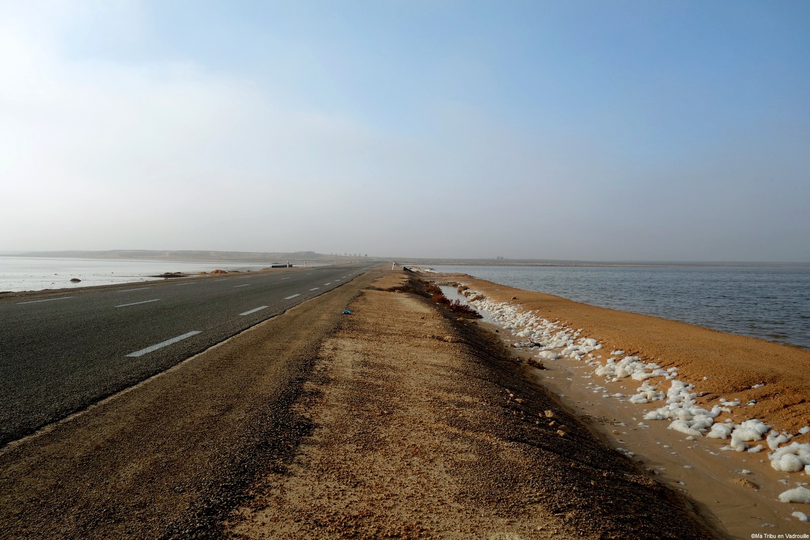 Quelques kilomètres après avoir rejoint le continent, notre premier arrêt se fait au lac salé de Sebkhet el Melah. Situé à Zarzis, première ville du continent après Djerba, ce lac salé est le second plus grand du pays après le Chott el Jérid. En ce jour de novembre, il y a beaucoup de vent et la mousse de sel vole dans tous les sens, à la plus grande joie des enfants !