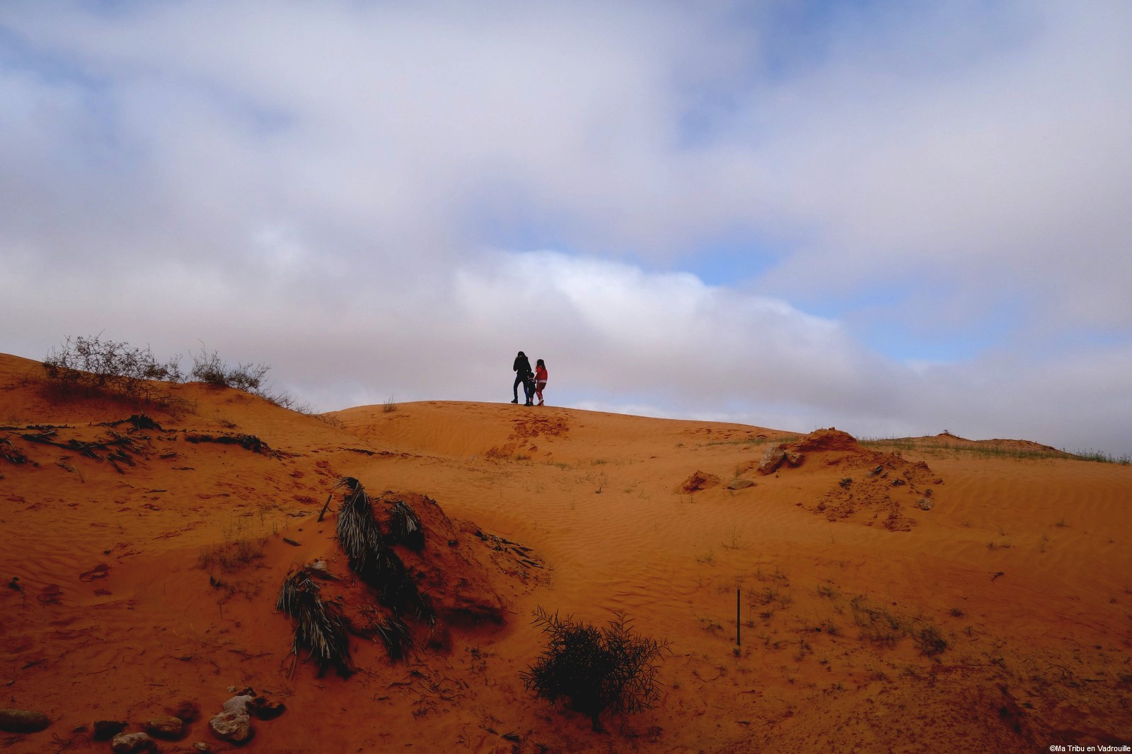 Au bout de plusieurs kilomètres, le paysage change. Le sable apparaît ça et là, à notre grande joie ! Nous faisons une halte au bord de la route, dans une sorte de campement. Les enfants se dégourdissent les jambes dans le sable et Nael commence à faire des pâtés ! On se croit déjà dans un autre monde.