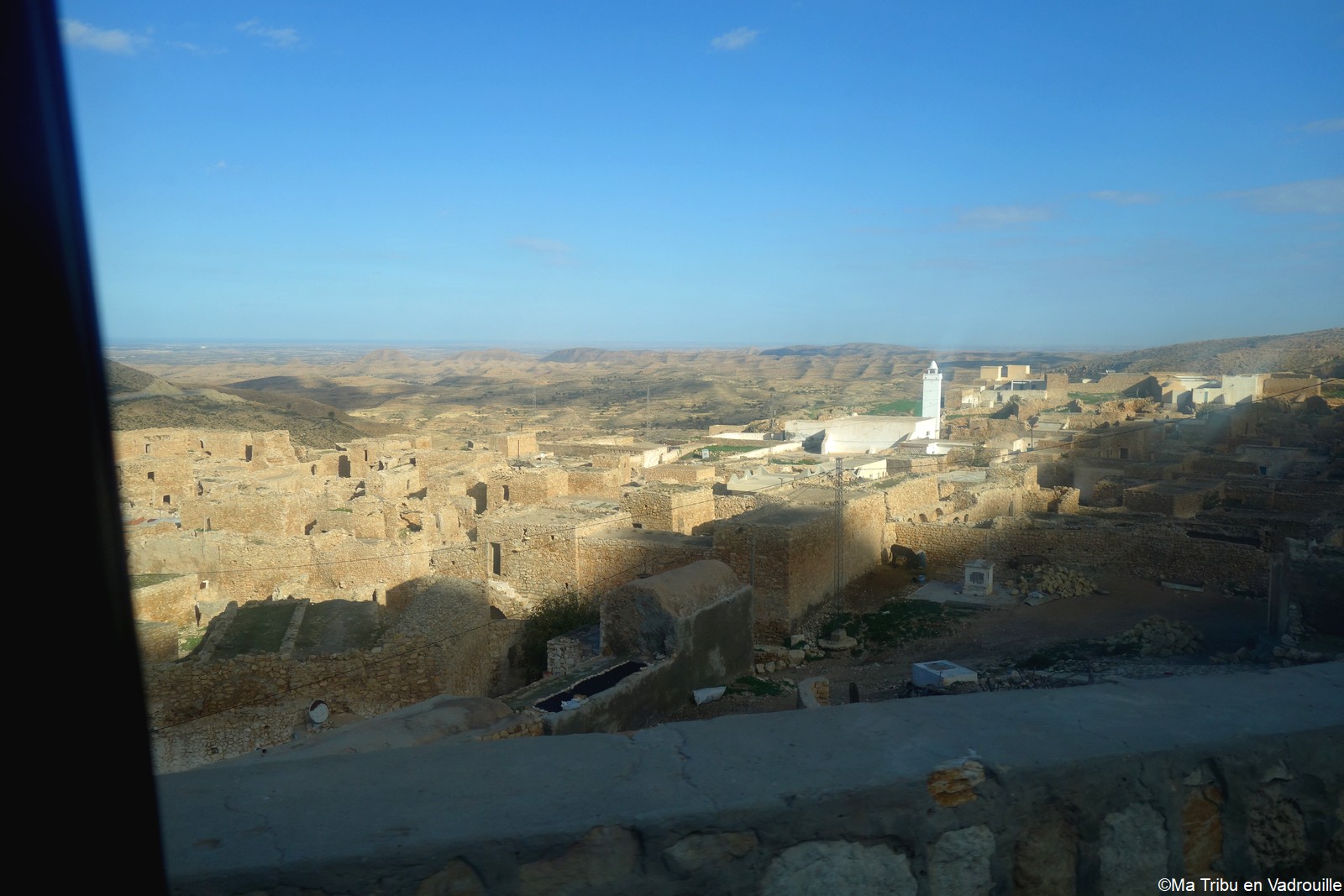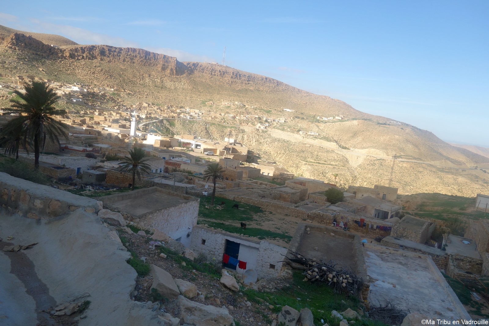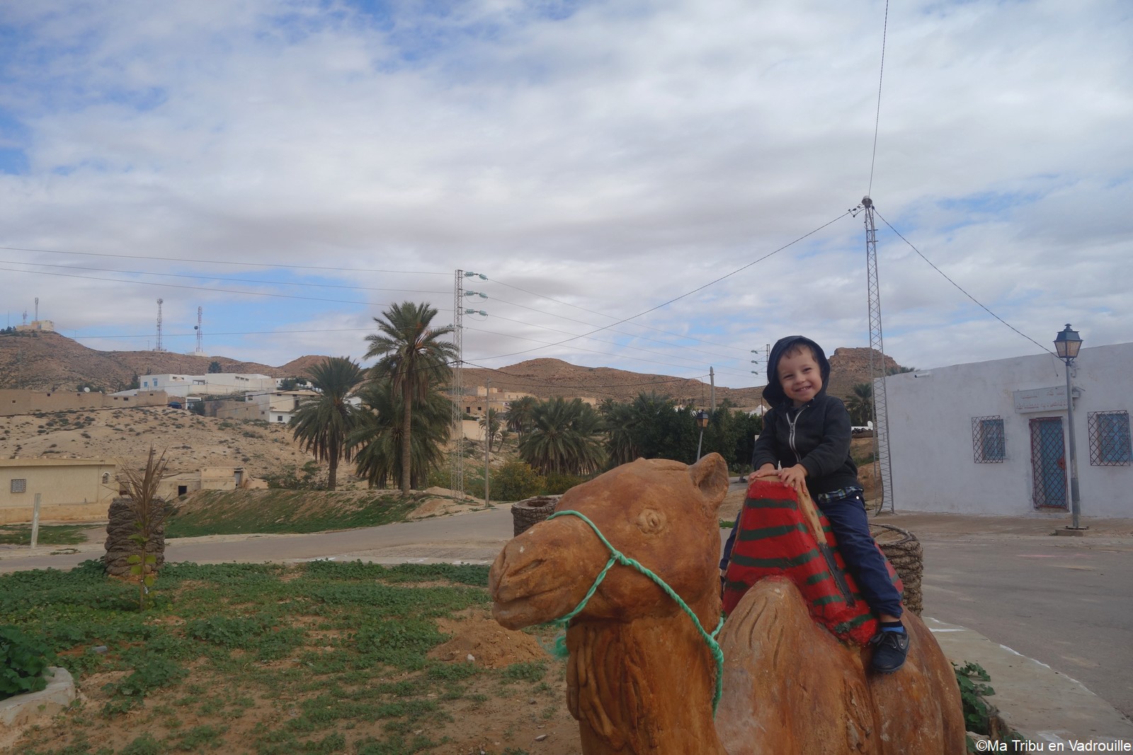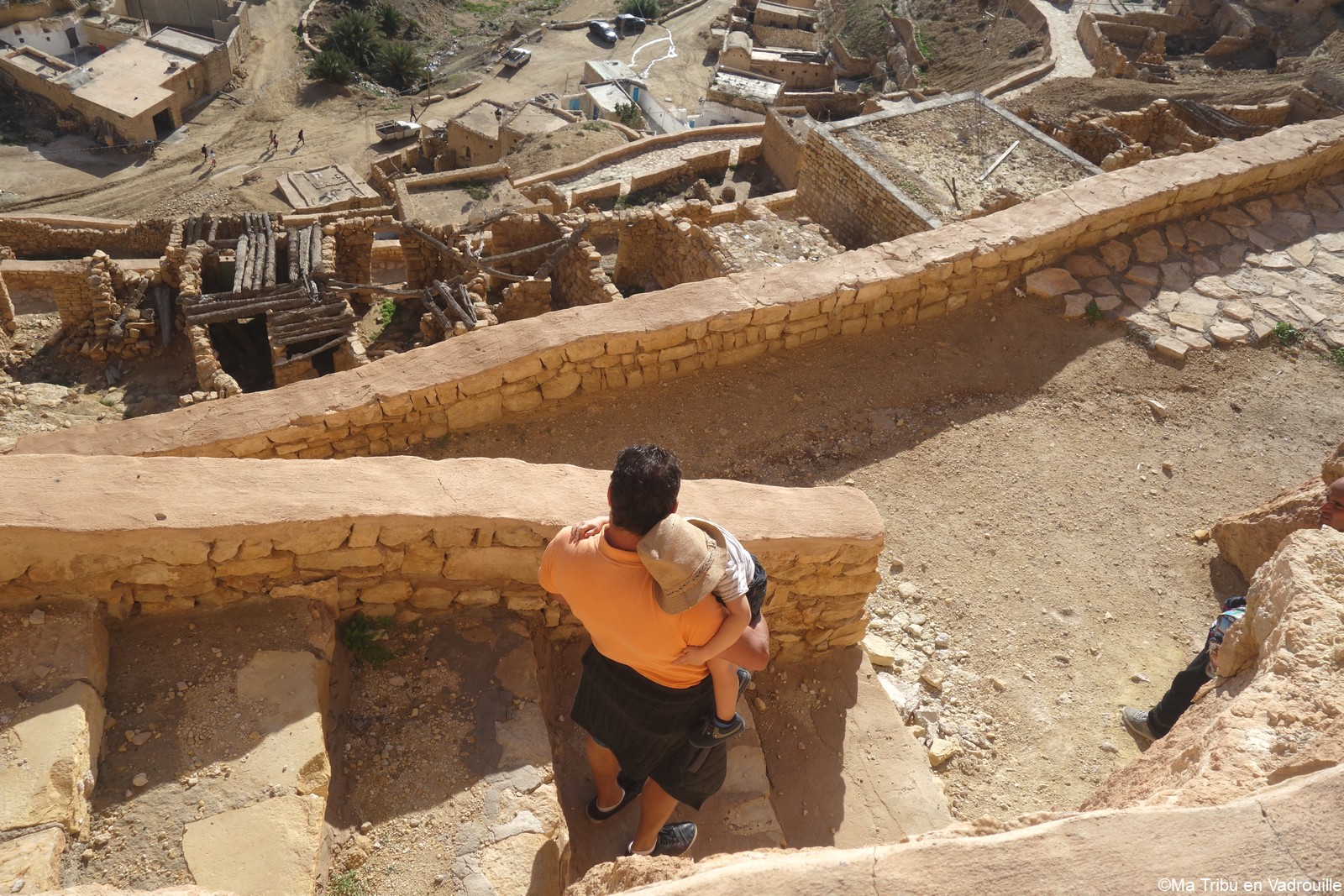 En début d’après-midi, un guide local vient nous chercher pour nous faire grimper sur les flancs du village. Il nous racontera l’histoire de ce village berbère qui possède encore une école et une vie locale. Une visite passionnante ! Nael finira par s’endormir d’abord sur le guide, qui ne le lâchait pas puis sur son père. Depuis le flanc arrière du village, les villageois nous montrent un des lieux de tournage des premiers Star Wars. Eh oui, c’est en Tunisie que le film a été tourné ! Nous n’osons pas dire que nous n’avons jamais vu la série… Je connais de nom bien sûr (qui ne connaît pas ?) mais je n’ai jamais regardé.