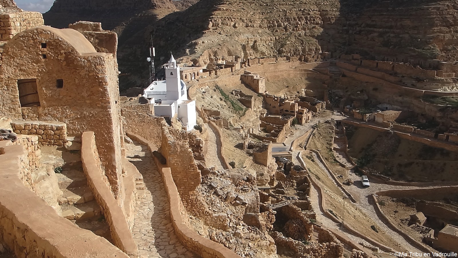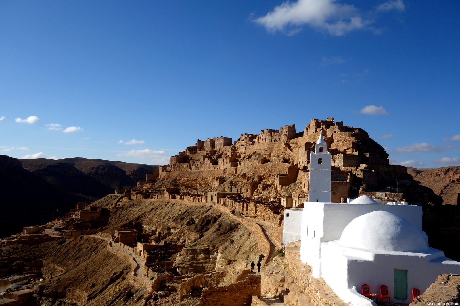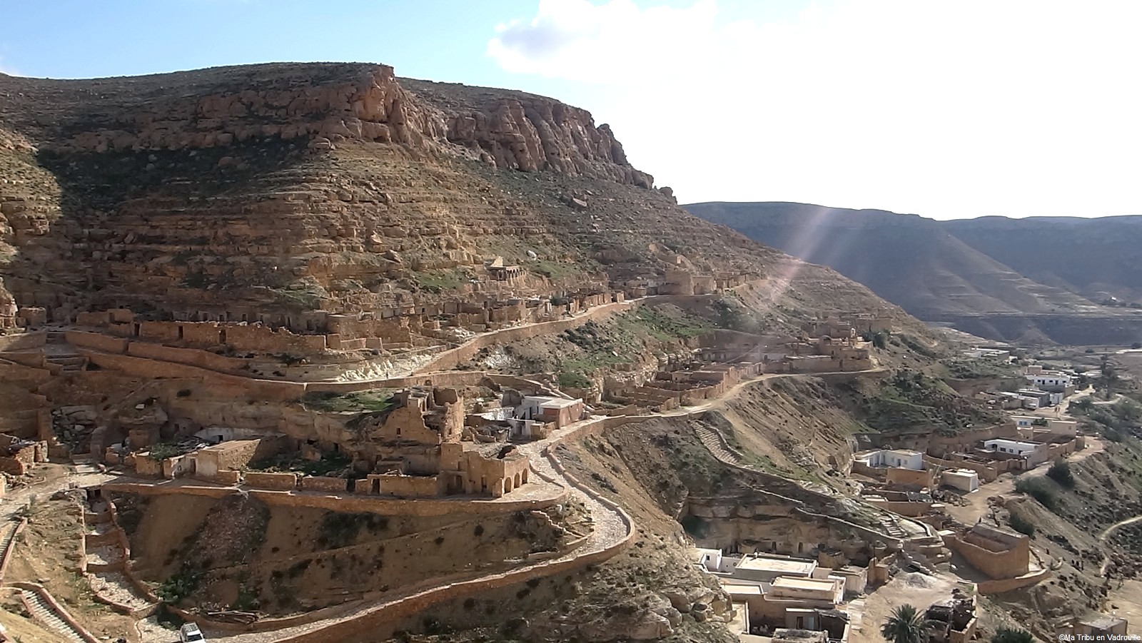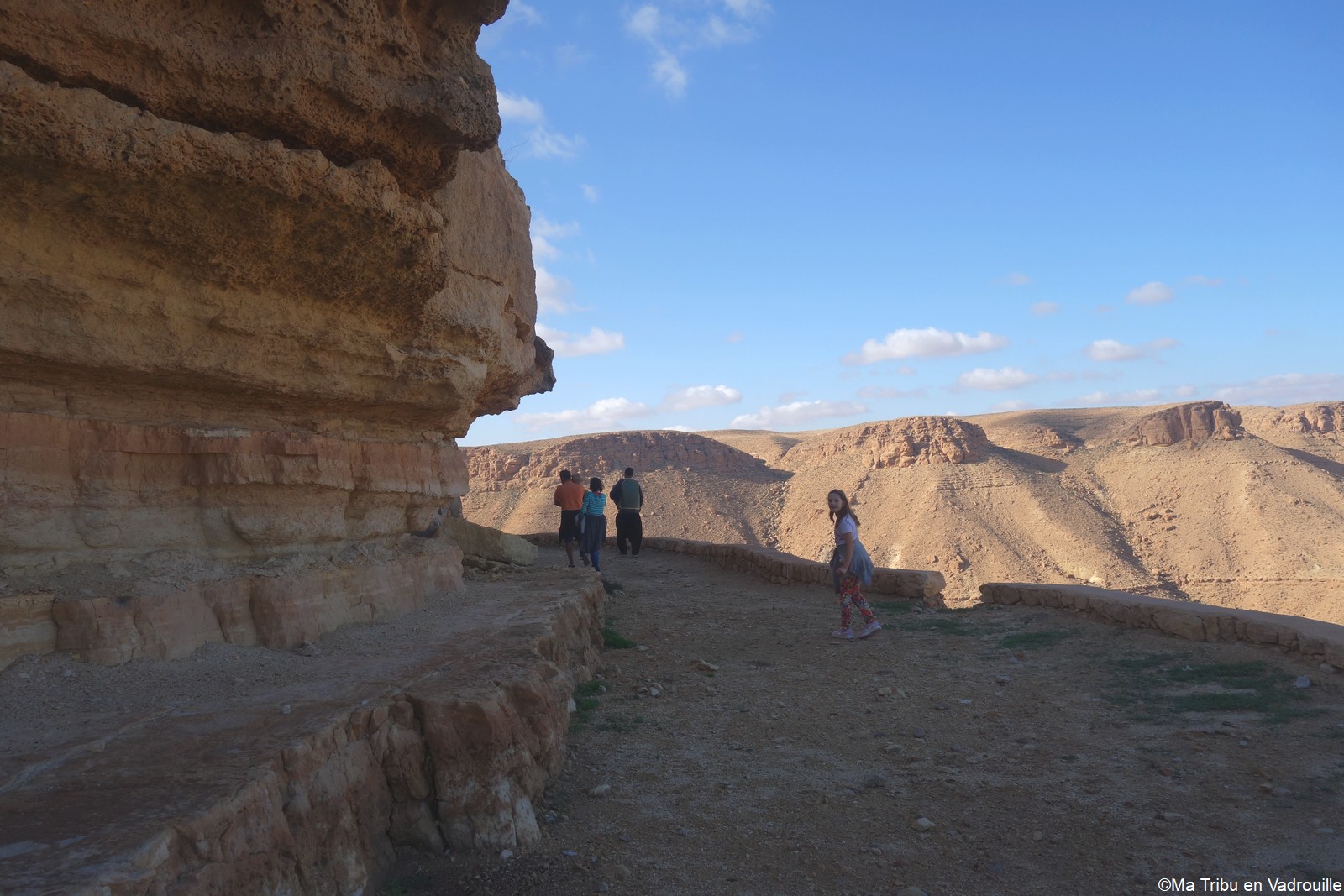 En début d’après-midi, un guide local vient nous chercher pour nous faire grimper sur les flancs du village. Il nous racontera l’histoire de ce village berbère qui possède encore une école et une vie locale. Une visite passionnante ! Nael finira par s’endormir d’abord sur le guide, qui ne le lâchait pas puis sur son père. Depuis le flanc arrière du village, les villageois nous montrent un des lieux de tournage des premiers Star Wars. Eh oui, c’est en Tunisie que le film a été tourné ! Nous n’osons pas dire que nous n’avons jamais vu la série… Je connais de nom bien sûr (qui ne connaît pas ?) mais je n’ai jamais regardé.