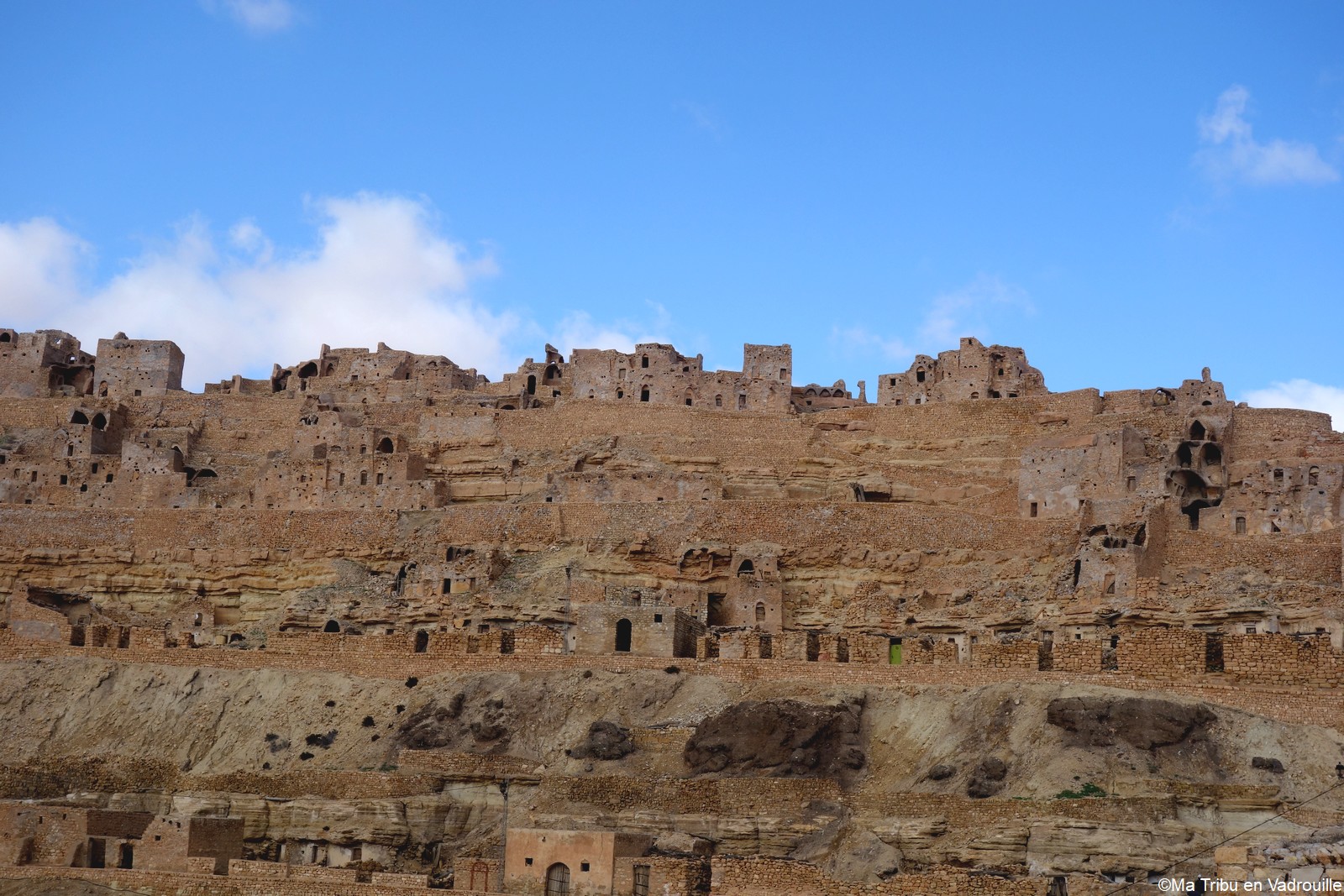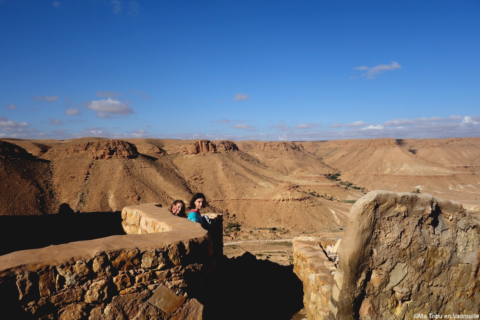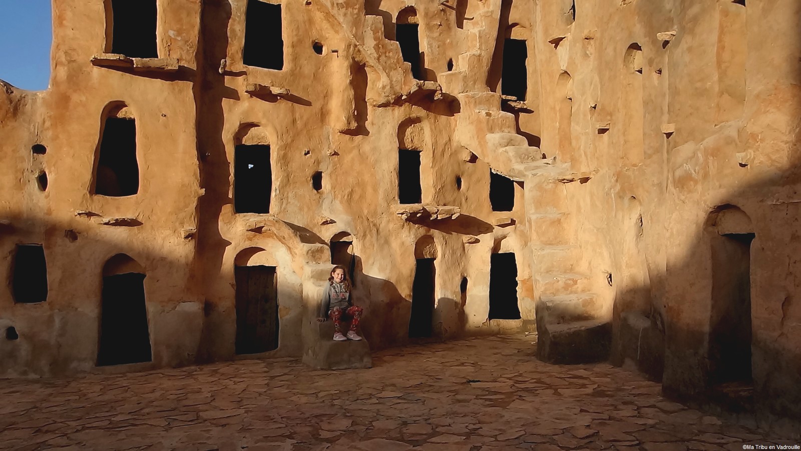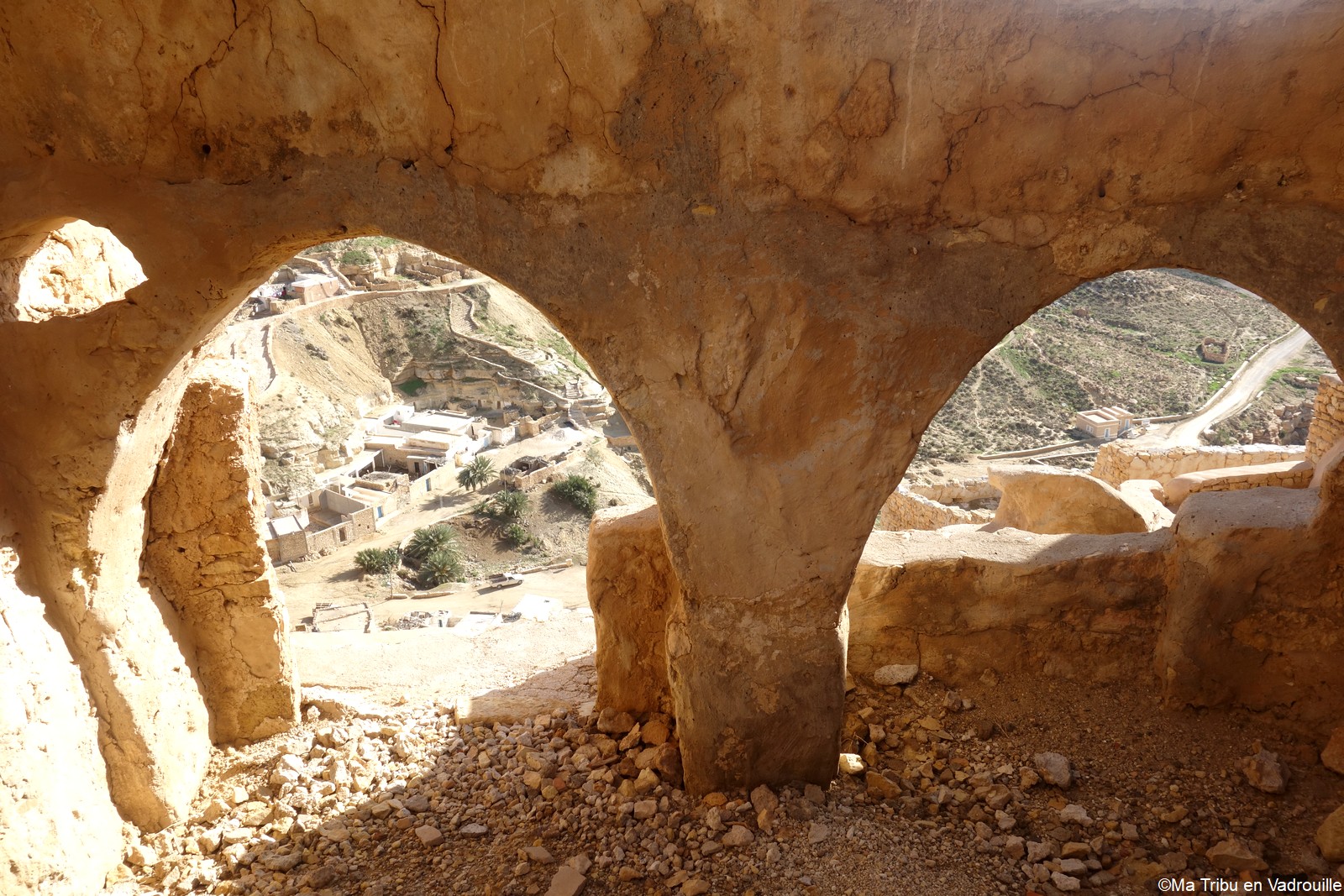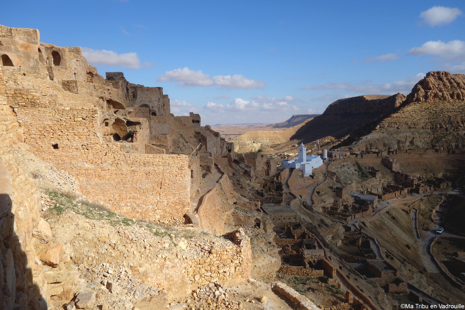 En début d’après-midi, un guide local vient nous chercher pour nous faire grimper sur les flancs du village. Il nous racontera l’histoire de ce village berbère qui possède encore une école et une vie locale. Une visite passionnante ! Nael finira par s’endormir d’abord sur le guide, qui ne le lâchait pas puis sur son père. Depuis le flanc arrière du village, les villageois nous montrent un des lieux de tournage des premiers Star Wars. Eh oui, c’est en Tunisie que le film a été tourné ! Nous n’osons pas dire que nous n’avons jamais vu la série… Je connais de nom bien sûr (qui ne connaît pas ?) mais je n’ai jamais regardé.