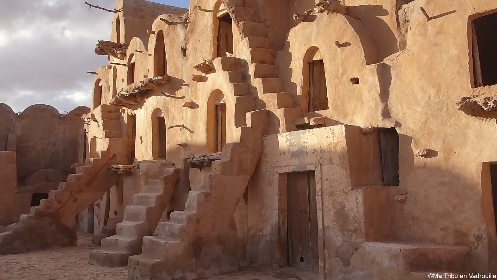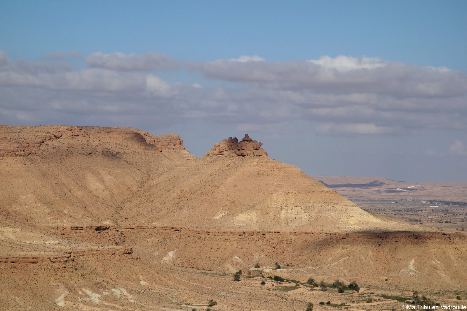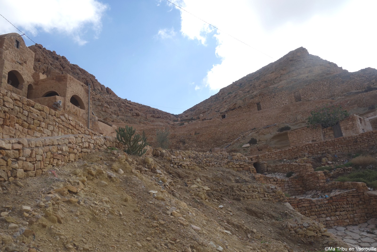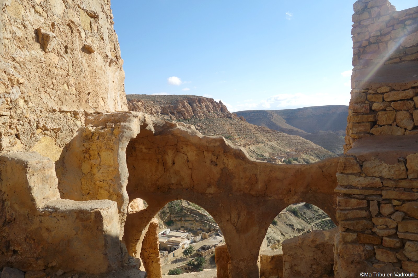 En début d’après-midi, un guide local vient nous chercher pour nous faire grimper sur les flancs du village. Il nous racontera l’histoire de ce village berbère qui possède encore une école et une vie locale. Une visite passionnante ! Nael finira par s’endormir d’abord sur le guide, qui ne le lâchait pas puis sur son père. Depuis le flanc arrière du village, les villageois nous montrent un des lieux de tournage des premiers Star Wars. Eh oui, c’est en Tunisie que le film a été tourné ! Nous n’osons pas dire que nous n’avons jamais vu la série… Je connais de nom bien sûr (qui ne connaît pas ?) mais je n’ai jamais regardé.