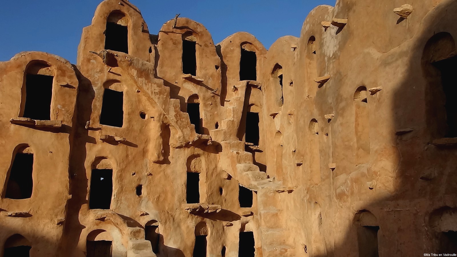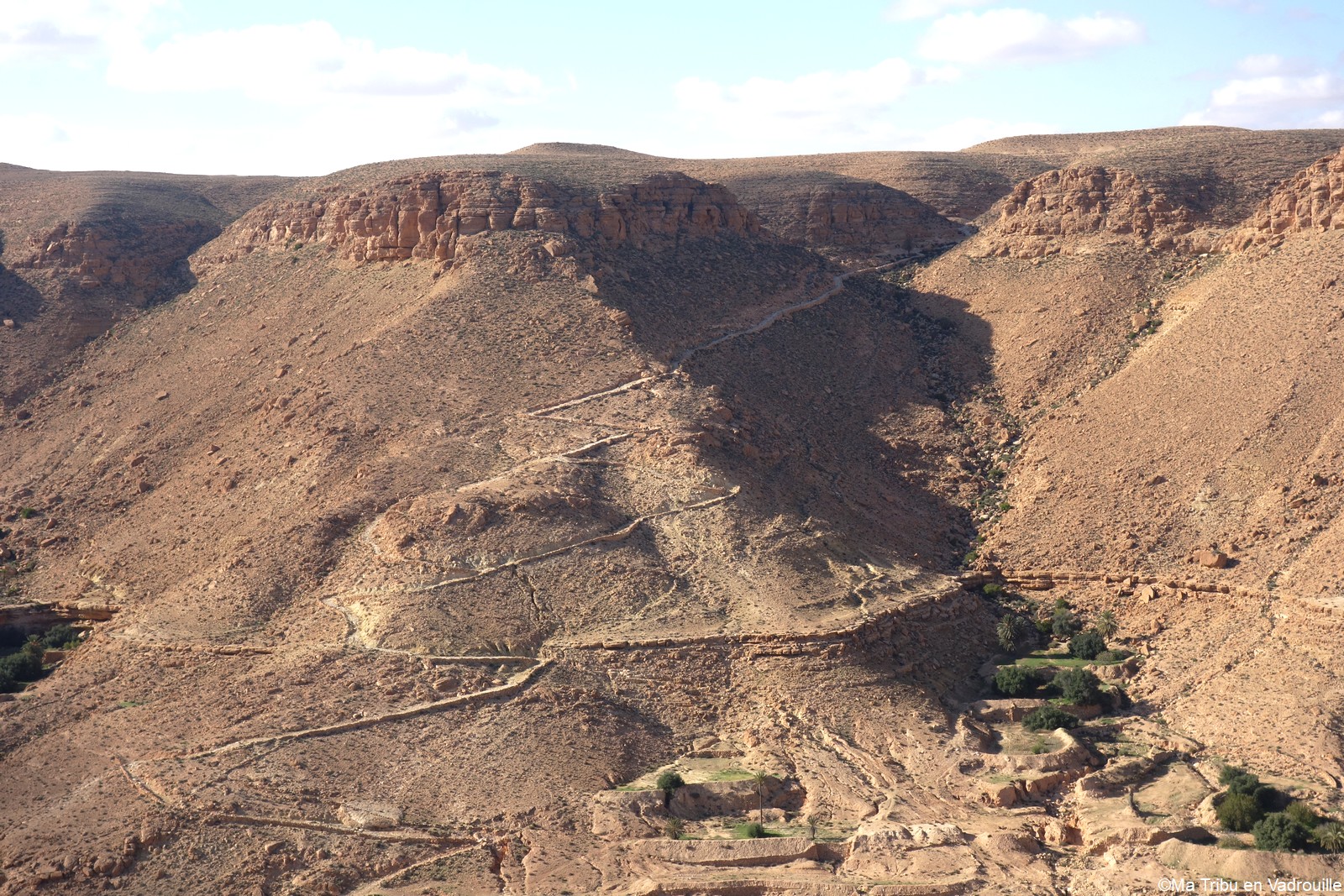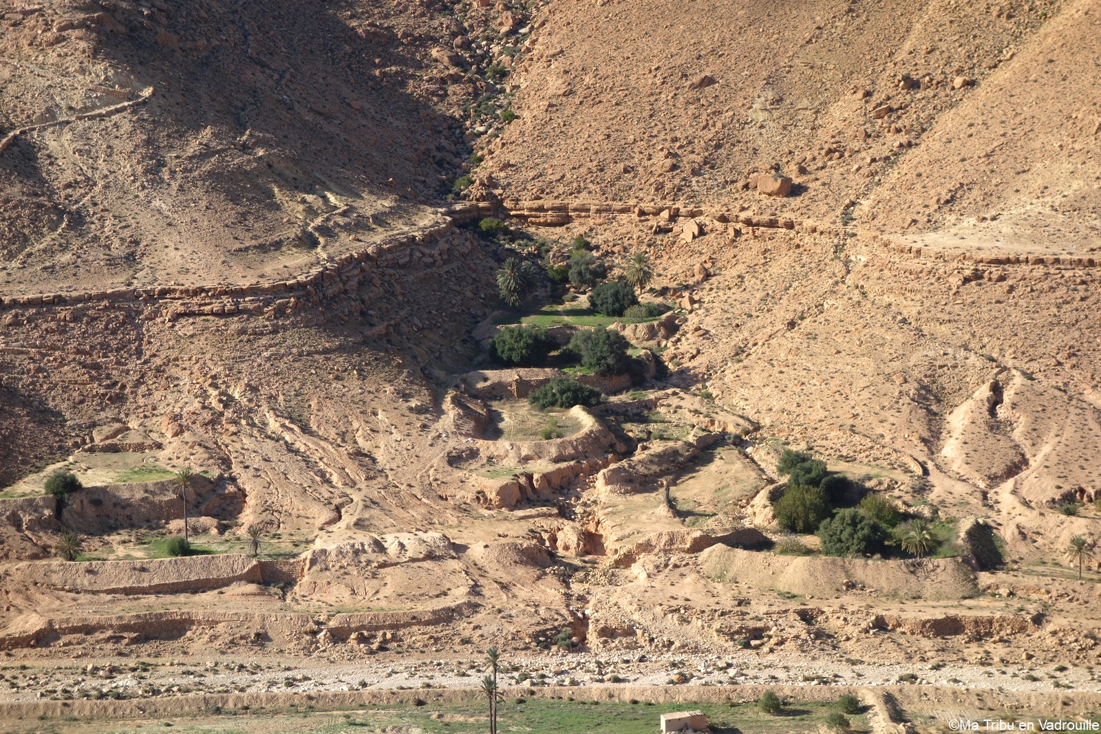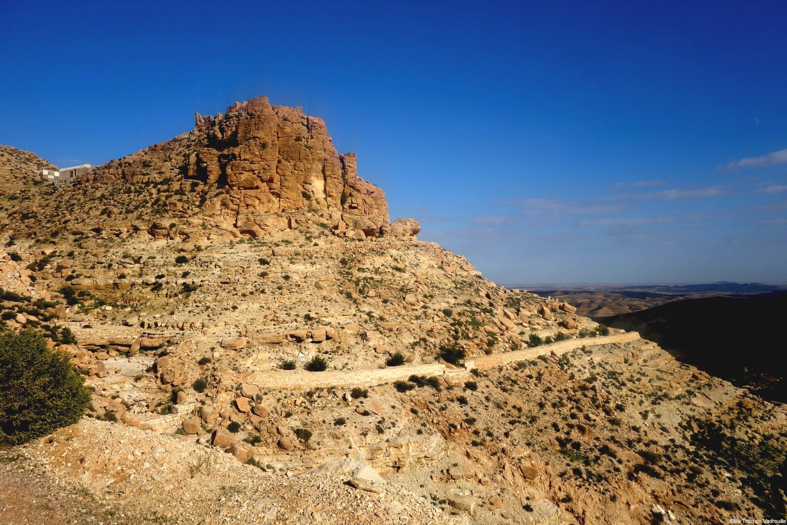 En début d’après-midi, un guide local vient nous chercher pour nous faire grimper sur les flancs du village. Il nous racontera l’histoire de ce village berbère qui possède encore une école et une vie locale. Une visite passionnante ! Nael finira par s’endormir d’abord sur le guide, qui ne le lâchait pas puis sur son père. Depuis le flanc arrière du village, les villageois nous montrent un des lieux de tournage des premiers Star Wars. Eh oui, c’est en Tunisie que le film a été tourné ! Nous n’osons pas dire que nous n’avons jamais vu la série… Je connais de nom bien sûr (qui ne connaît pas ?) mais je n’ai jamais regardé.