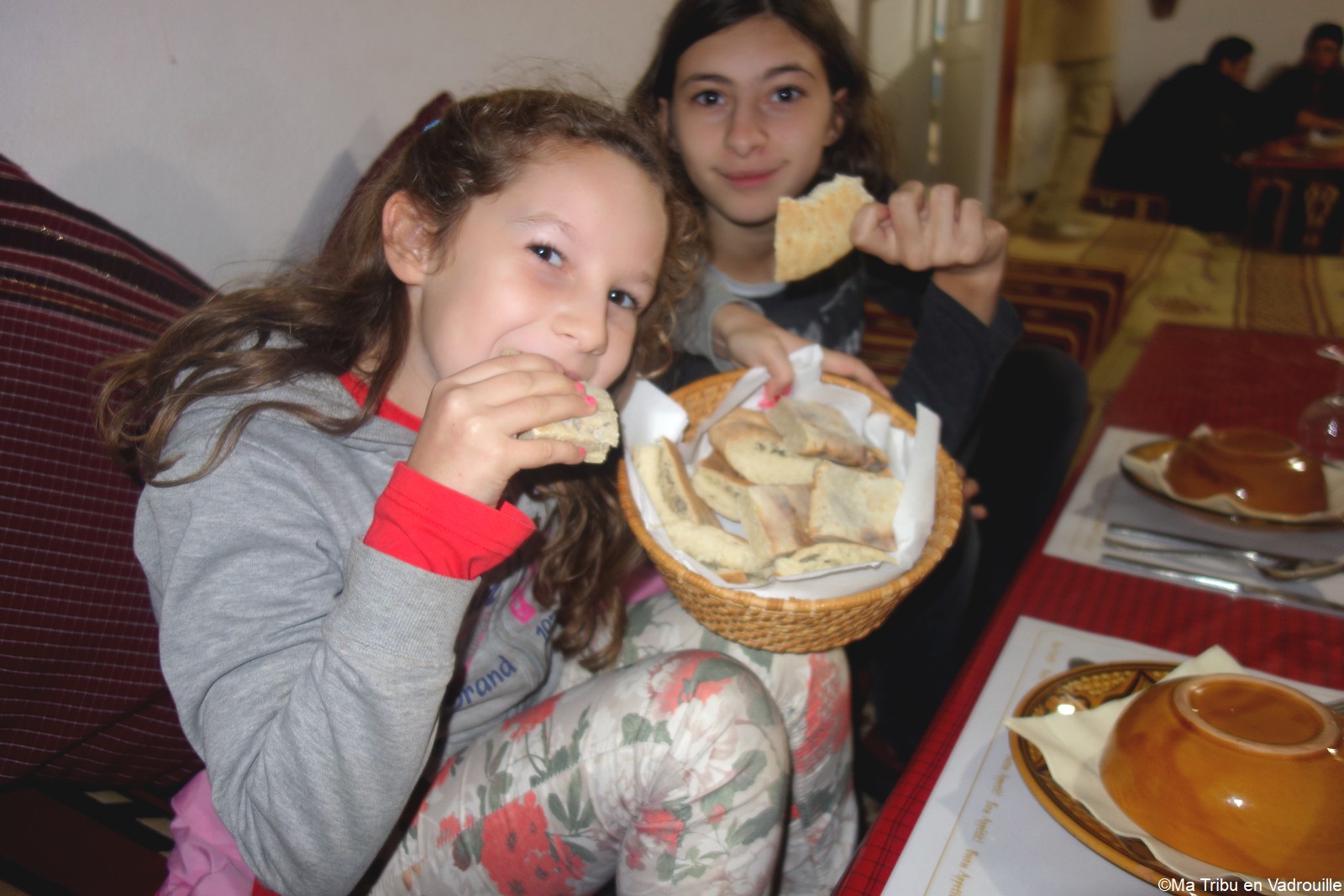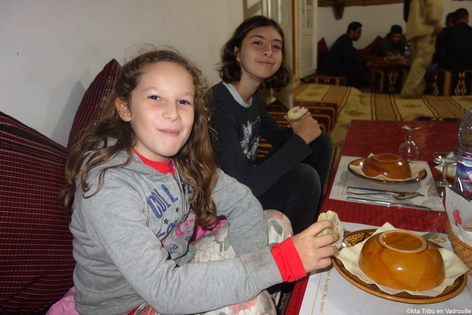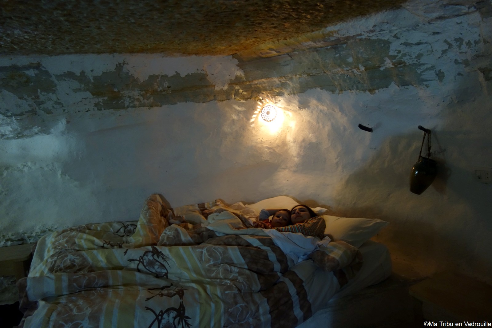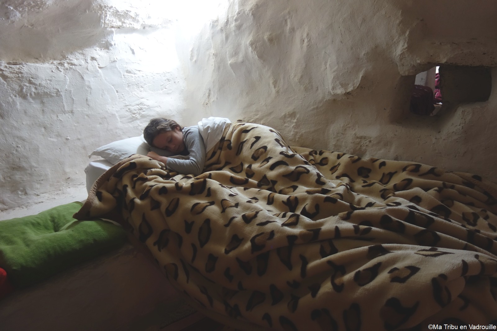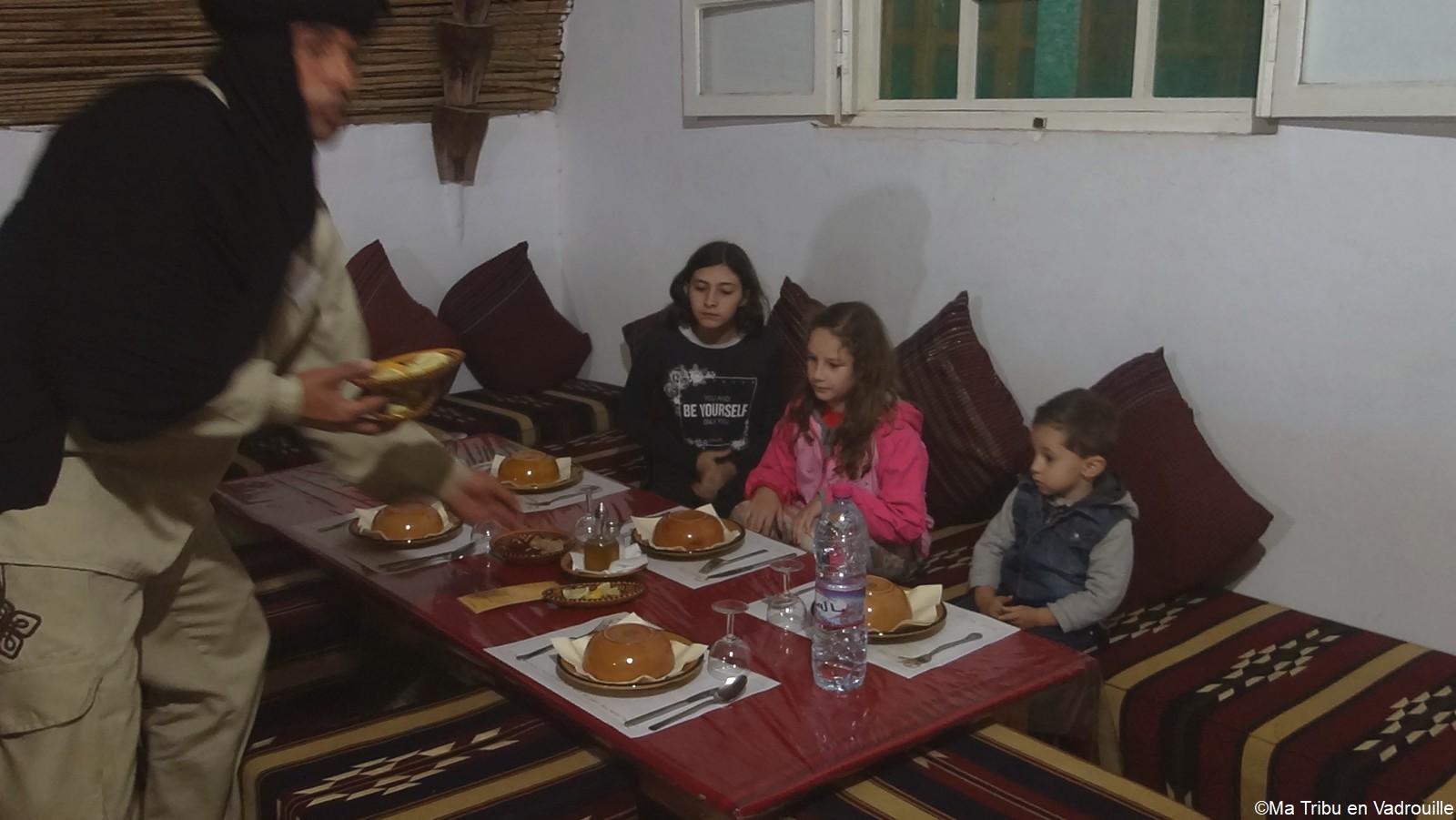 Nous déposons nos affaires dans la maison d’hôtes qui nous hébergera cette nuit. Notre immense chambre familiale est aussi troglodyte ! Nous allons dormir dans une grotte et les enfants sont ravis. Nous rejoignons ensuite le petit restaurant, un peu plus bas. Un délicieux repas local, servi par des locaux souriants et amusés de voir nos enfants.
