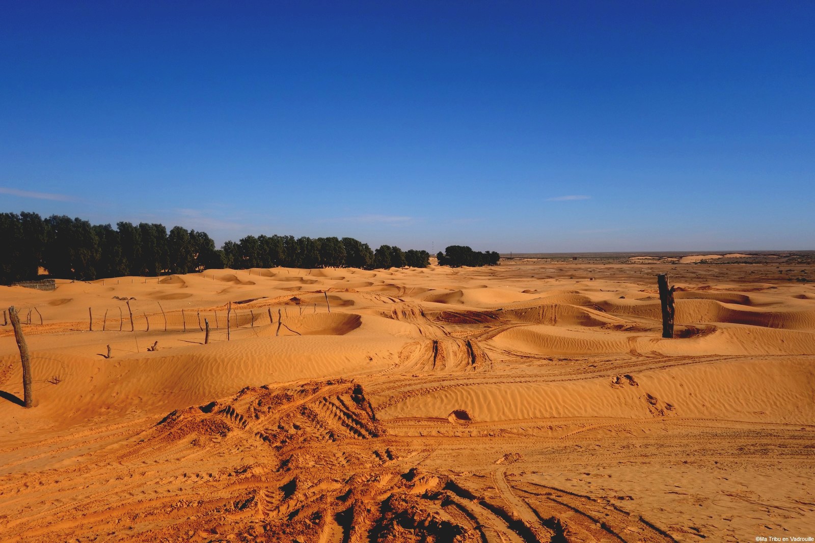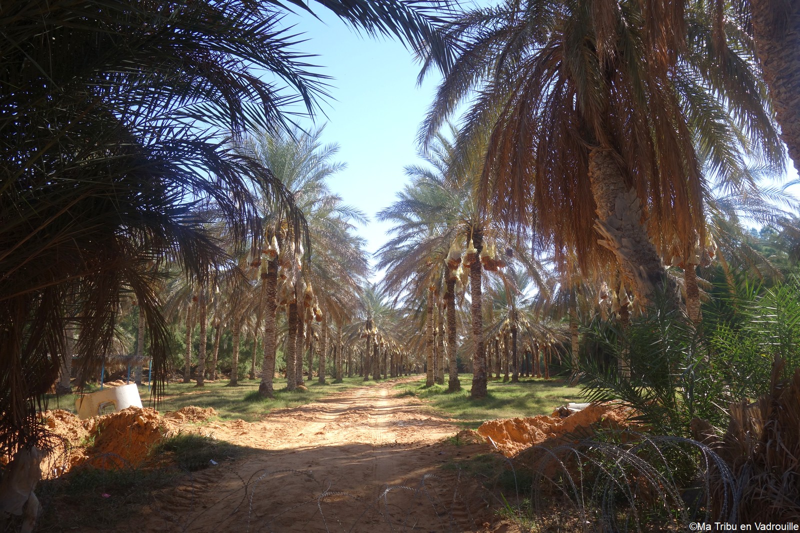 Au bout de plusieurs kilomètres, une oasis se profilent devant nous : Ksar Ghilane. De loin, on aperçoit des milliers de palmiers et… pas mal de touristes qui arrivent par bus ! Des campings sont installés à l’intérieur, ainsi que des restaurants, des cafés et l’on peut même faire des tours en quads ou en dromadaires. Bref, je sens tout de suite que je ne vais pas aimer ! Trop touristique pour moi et je suis déçue de la source d’eau chaude où soit disant l’on peut se baigner. Elle fait sale et surtout les terrasses des cafés l’entourent ! Il faut vraiment avoir envie de se baigner…