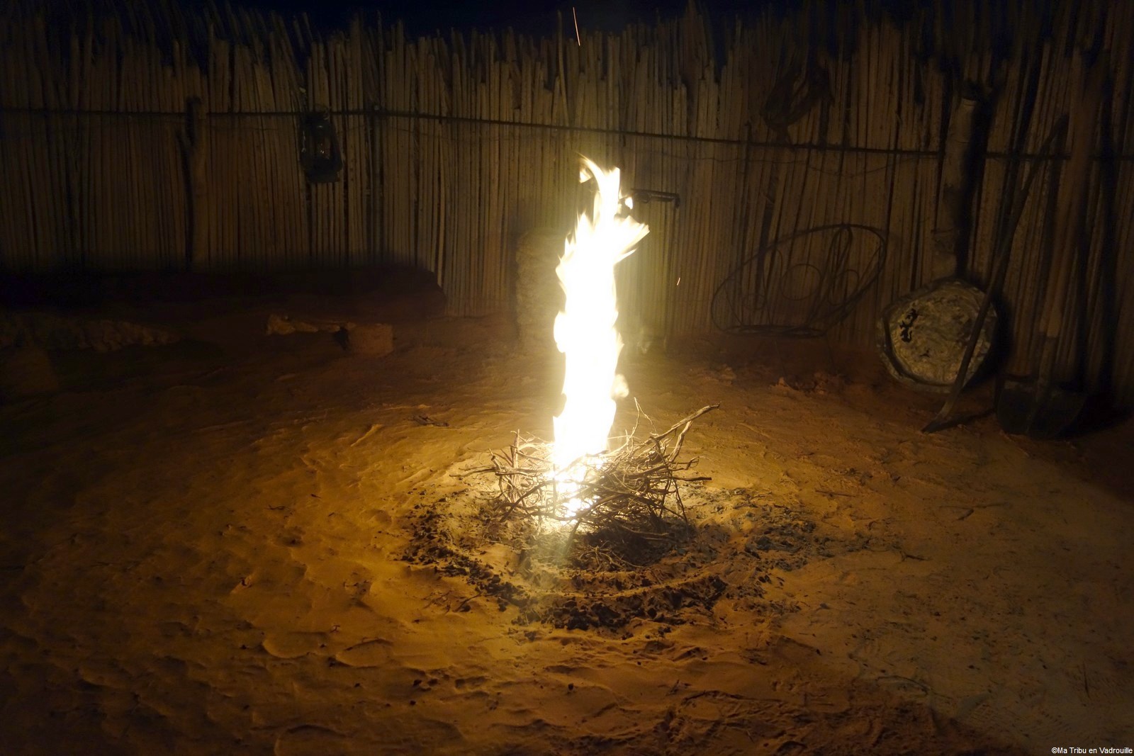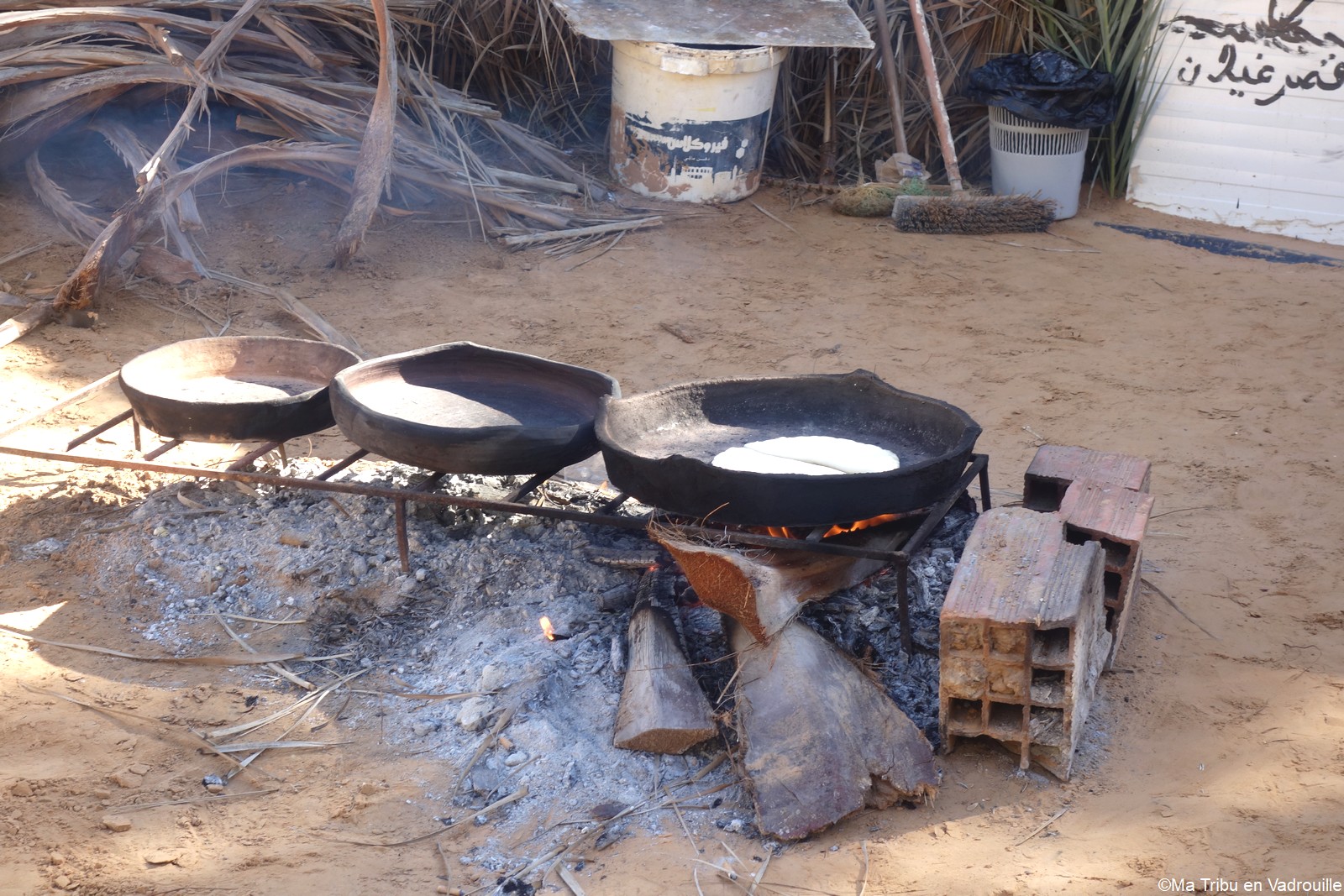 Nous sommes assis autour d’un feu et un cuisinier arrive pour faire cuire un taguella. Ce pain plat est glissé sous la cendre à même le sable. Nous pourrons observer la cuisson du début à la fin ! Nael a même participé. Et on peut vous dire que cette galette est délicieuse ! Ainsi que le repas que nous avons pris au campement.