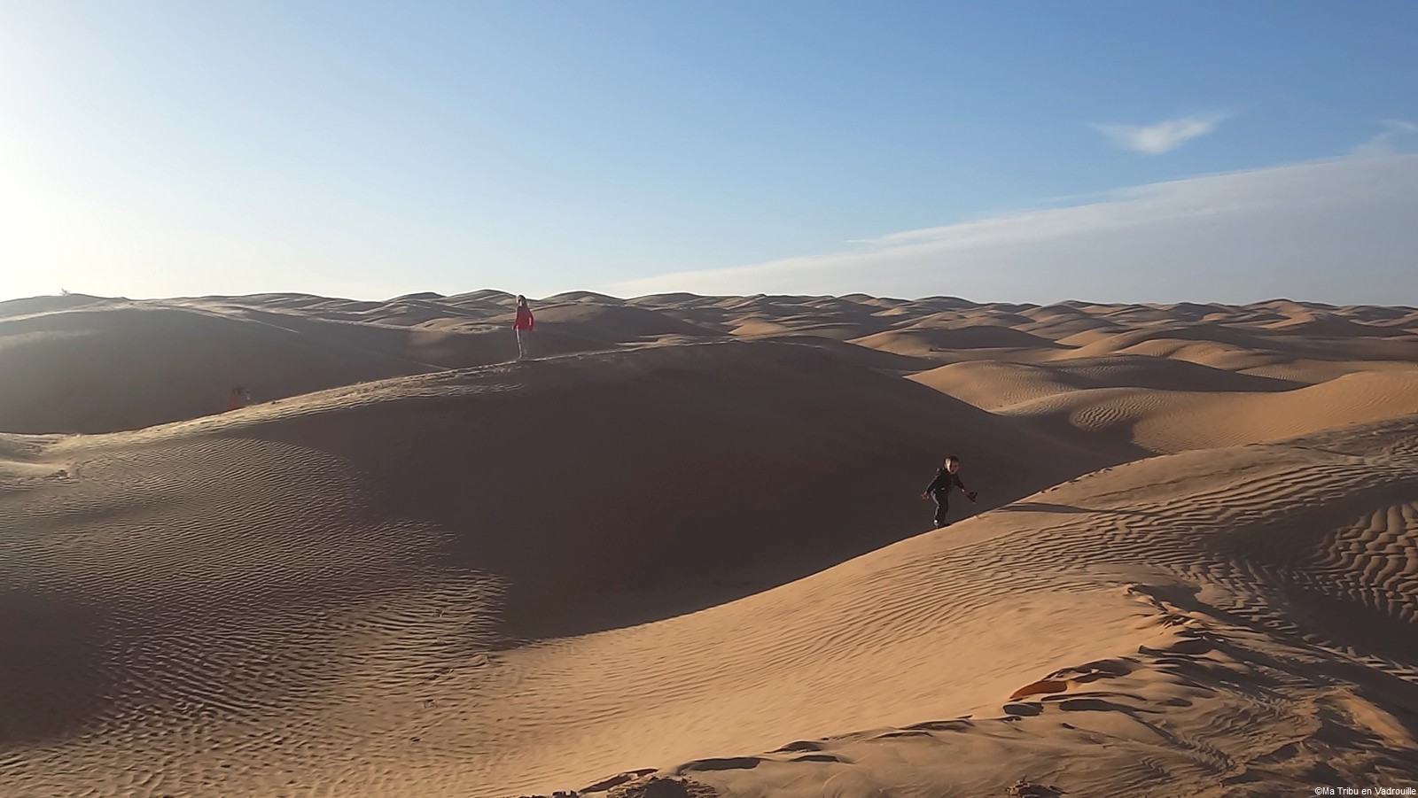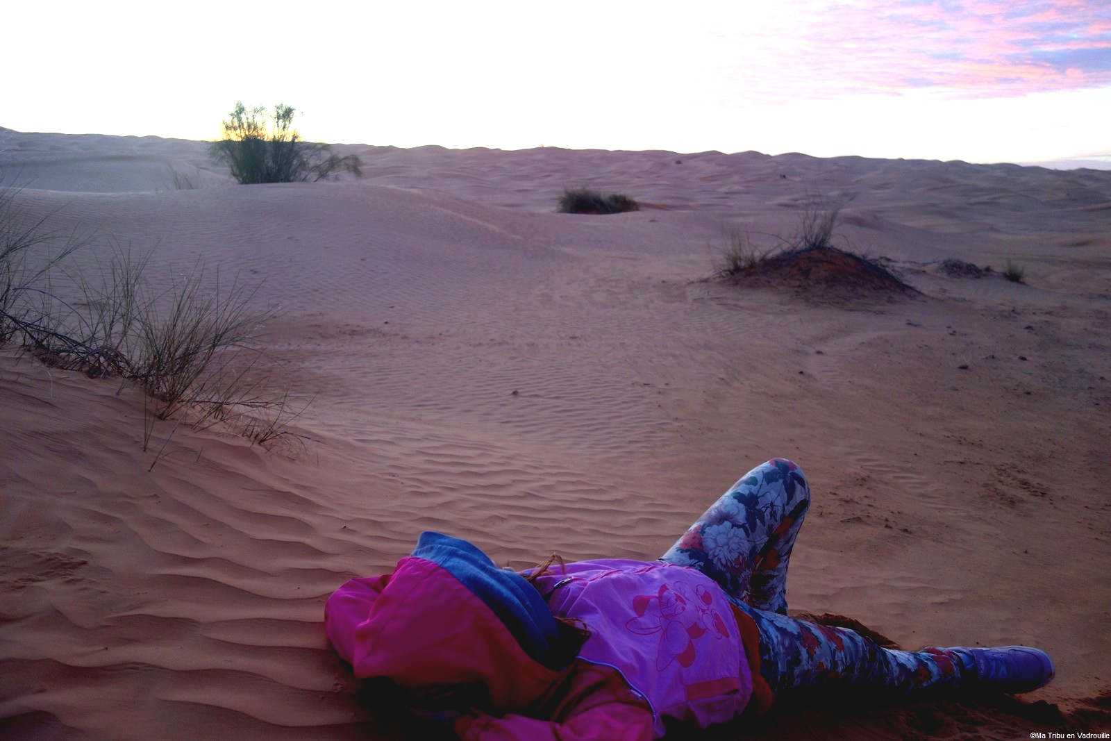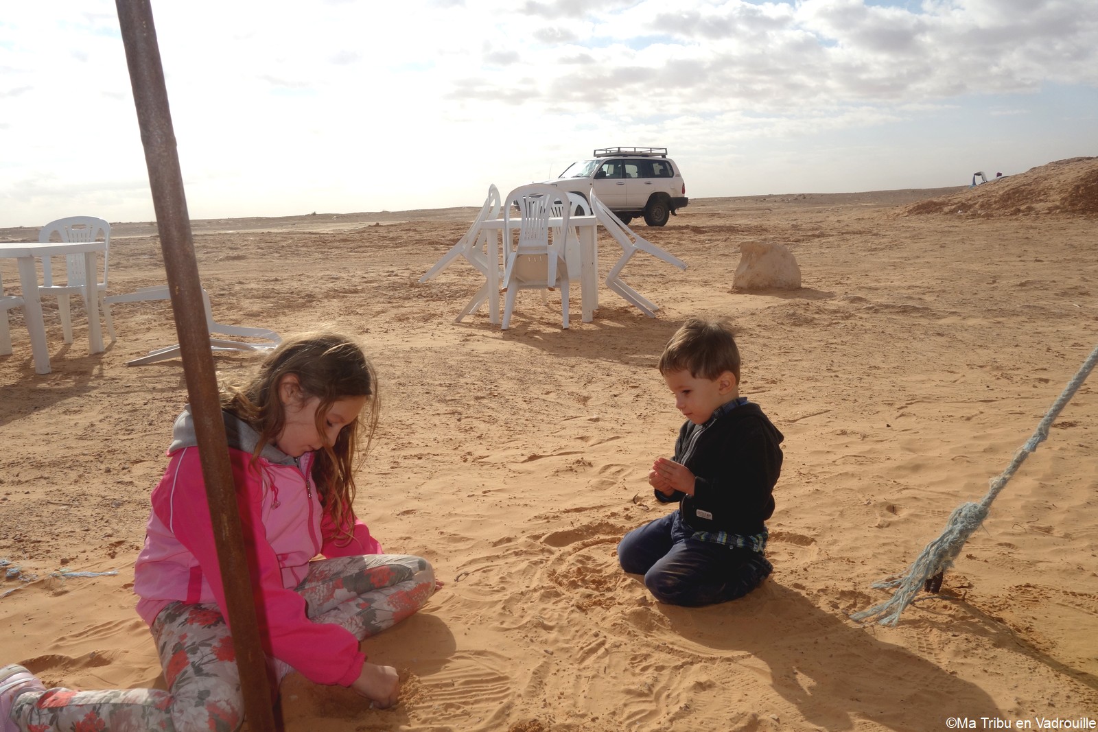 En fin d’après-midi, nous arrivons enfin au campement, niché dans les dunes du désert tunisien. Nous partons de suite explorer les dunes, en essayant d’aller le plus loin possible ! Des montées, des descentes… il y a de quoi s’amuser pour les enfants ! Nael s’amuse dans le bac à sable géant et naturel.