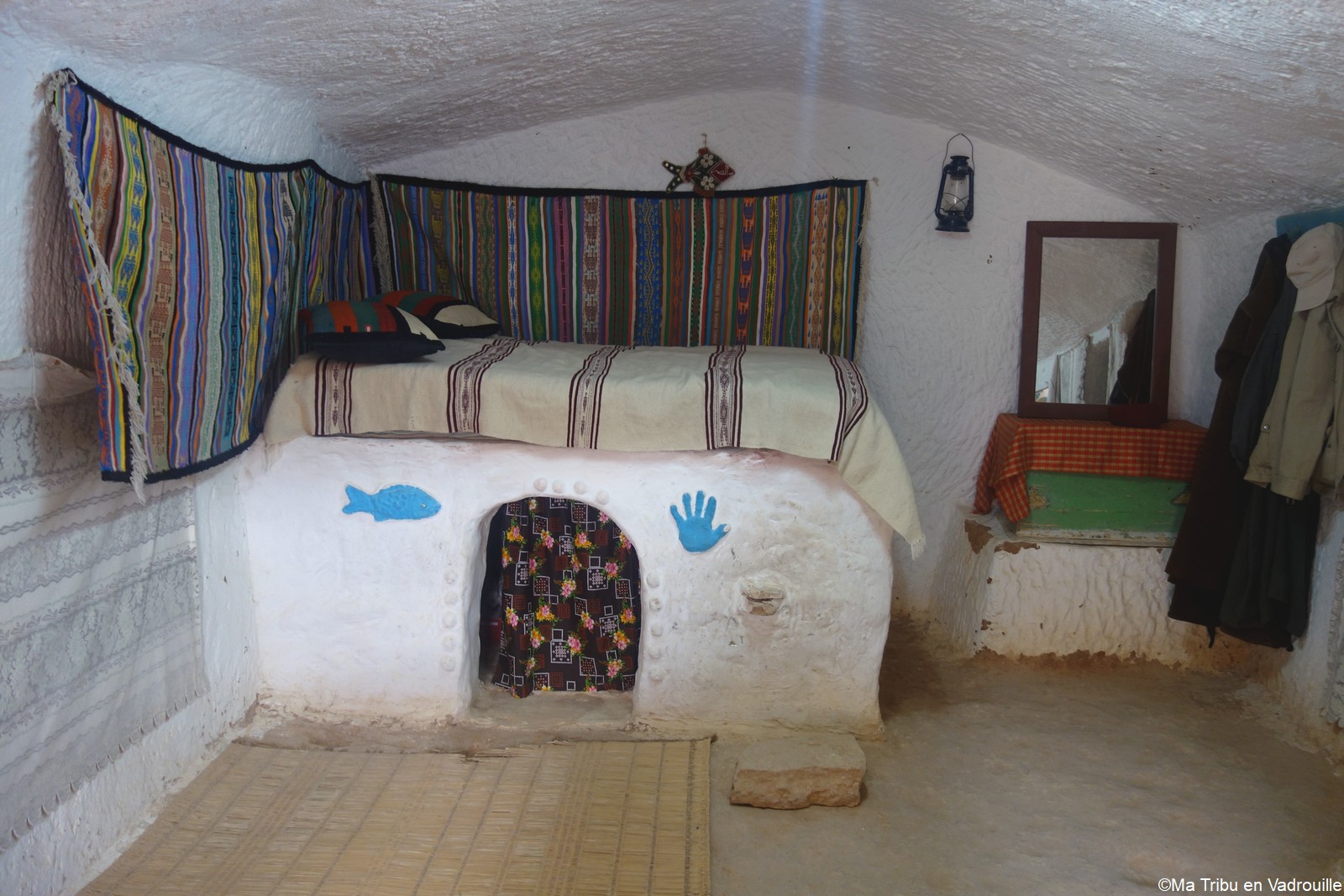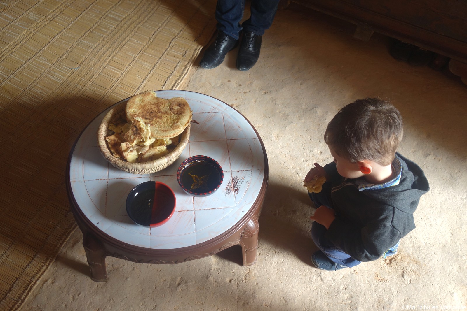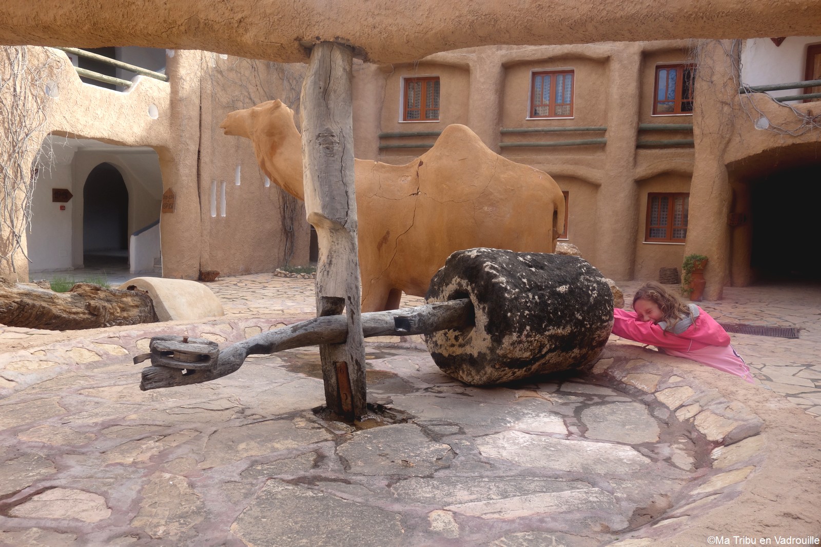 Puis on continue la route pour rejoindre Matmata. Là, on entre dans une maison troglodyte qui fait office de petit musée. Une famille nous y accueille et nous fait visiter l’endroit. Une dame pose du pain chaud sur une table et nous explique que nous devons le tremper dans l’huile d’olive puis dans le miel avant de le manger. Nael et Inès finissent la panière en se léchant les doigts ! Amusée, notre hôte repart vite en cuisine pour préparer d’autres pains… malgré mes protestations. Mais elle était toute fière que les enfants adorent ! Nous avons aussi essayé de moudre le blé pour faire de la farine, à l’ancienne. Bref, une jolie visite très instructive !