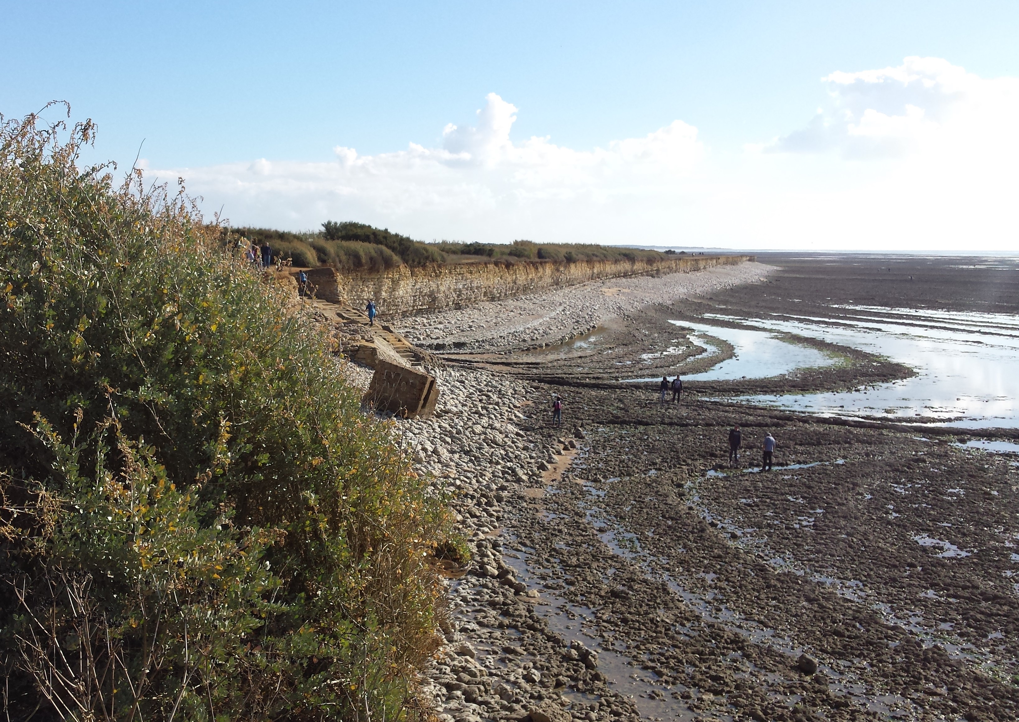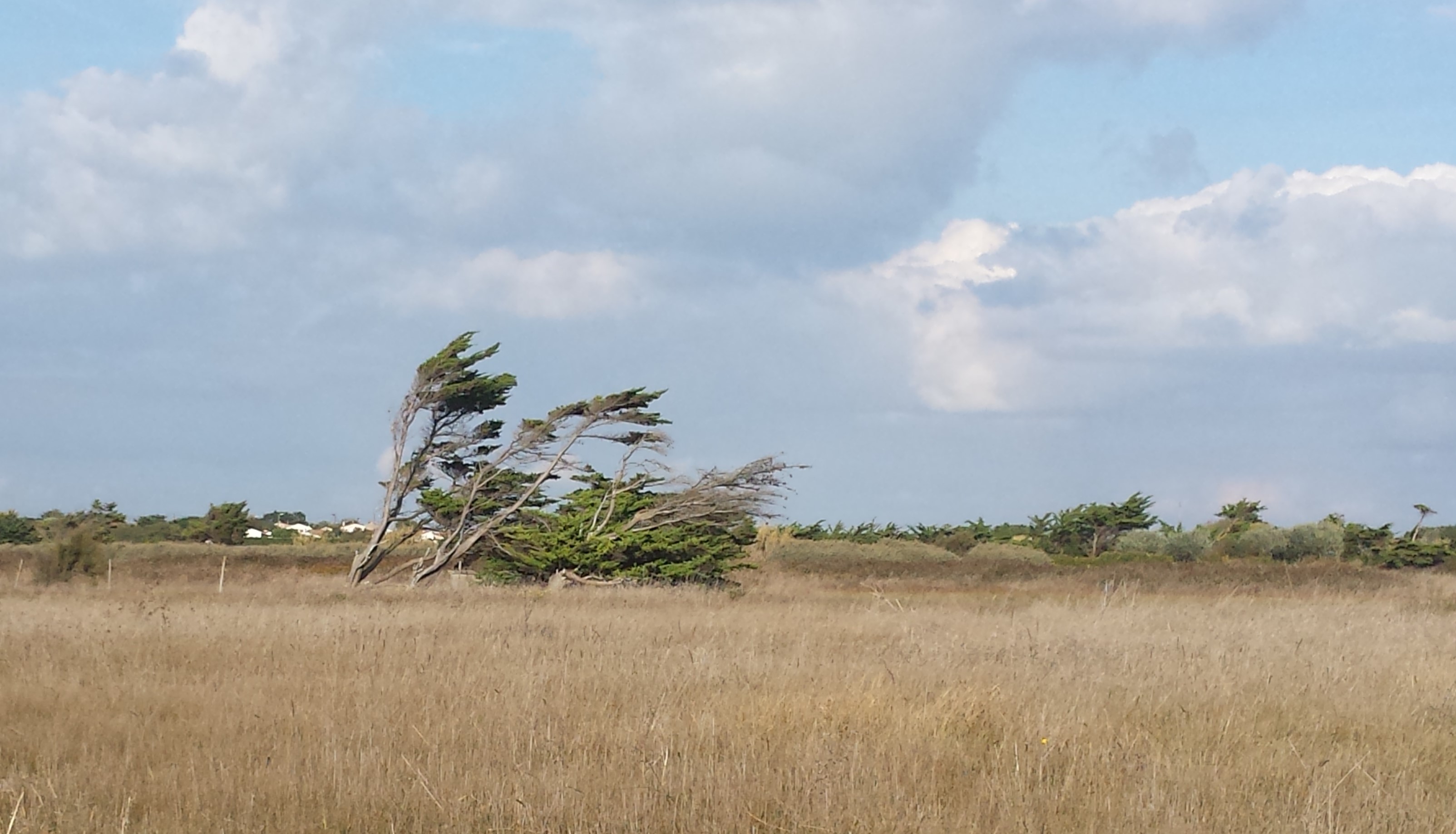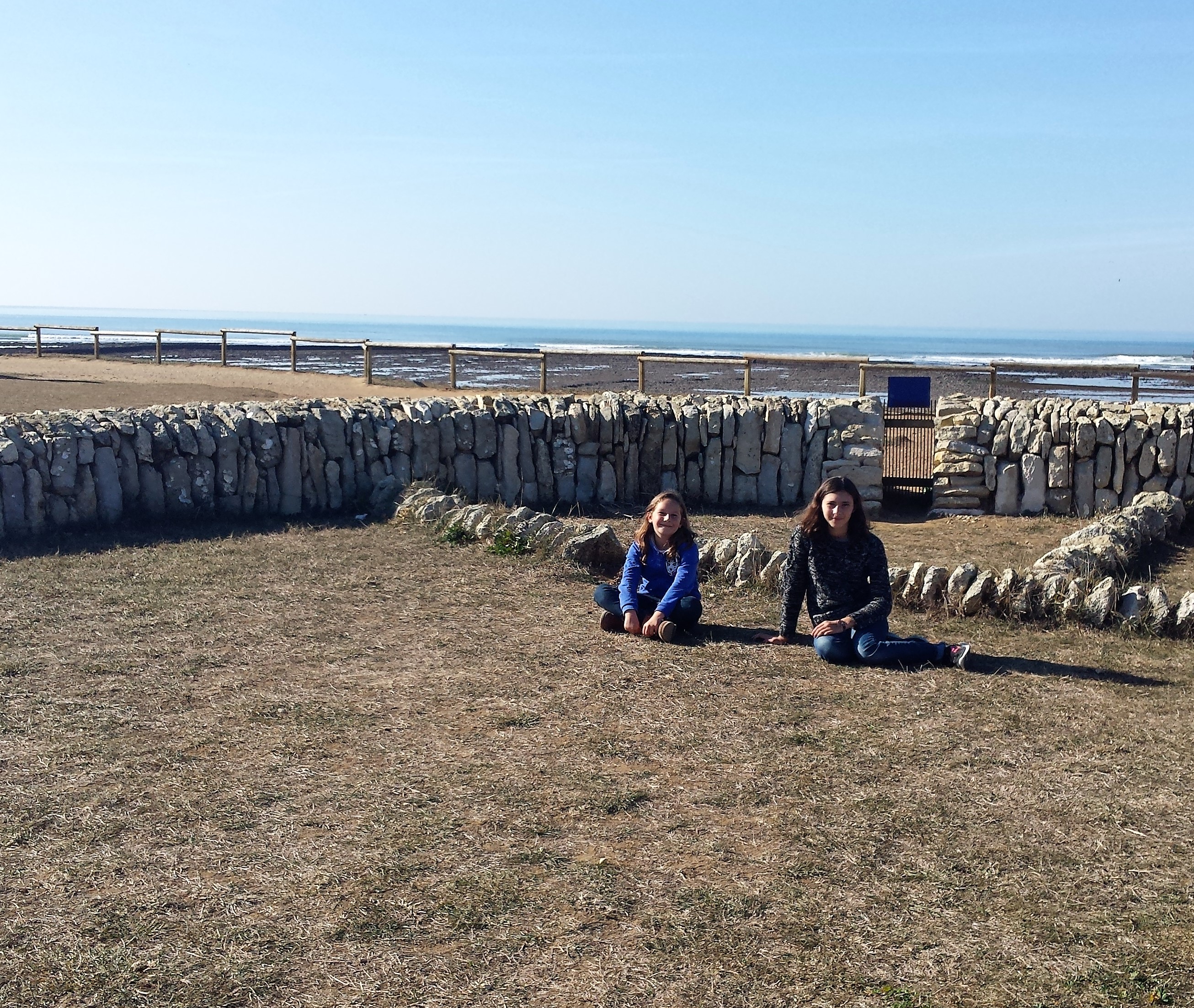 Nous nous dirigeons ensuite vers la présentation de l’écluse à poisson, au-dessus de la falaise. On en voit, plus bas, dans la vase. Ce sont les grandes marées en ce moment, et la mer s’est retirée très loin. On voit de nombreux pêcheurs à pied et même… des surfeurs ! Ils doivent marcher loin pour rejoindre les vagues. Cet endroit est tellement venté, surtout l’hiver, que même les arbres s’inclinent !