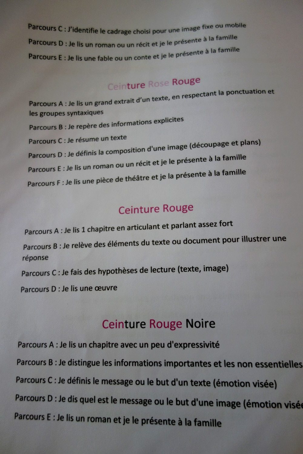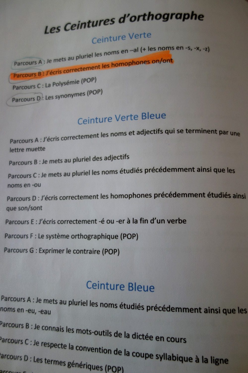 Pour certaines ceintures, elle commence au niveau orange (écrivain car elle n’a pas l’habitude d’écrire) et pour d’autres au niveau vert, bleu ou rose). À savoir que j’ai planifié sur 2 ans, donc si elle termine tout, elle en sera au niveau fin de 6ème !