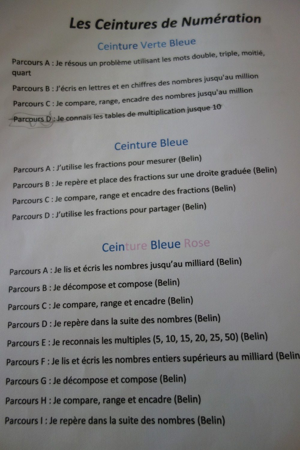 J’ai mis plusieurs mois à comprendre le concept, alors je vais essayer de vous l’expliquer le plus simplement possible. Fernand Oury avait constaté que chaque élève progressait différemment. Certains comprenaient plus vite la géométrie, par exemple, et d’autres la conjugaison. Là-dessus, je suis d’accord, les enfants ont tous un niveau différent au sein d’une classe ! Il a donc élaboré des ceintures de couleur (de la blanche à la noire en passant par la jaune, la bleue, etc.) en augmentant la difficulté au fur et à mesure. Plus de maths et de français, mais des notions précises : Géométrie, Calcul mental, Numération, Orthographe, Vocabulaire, Grammaire, etc.