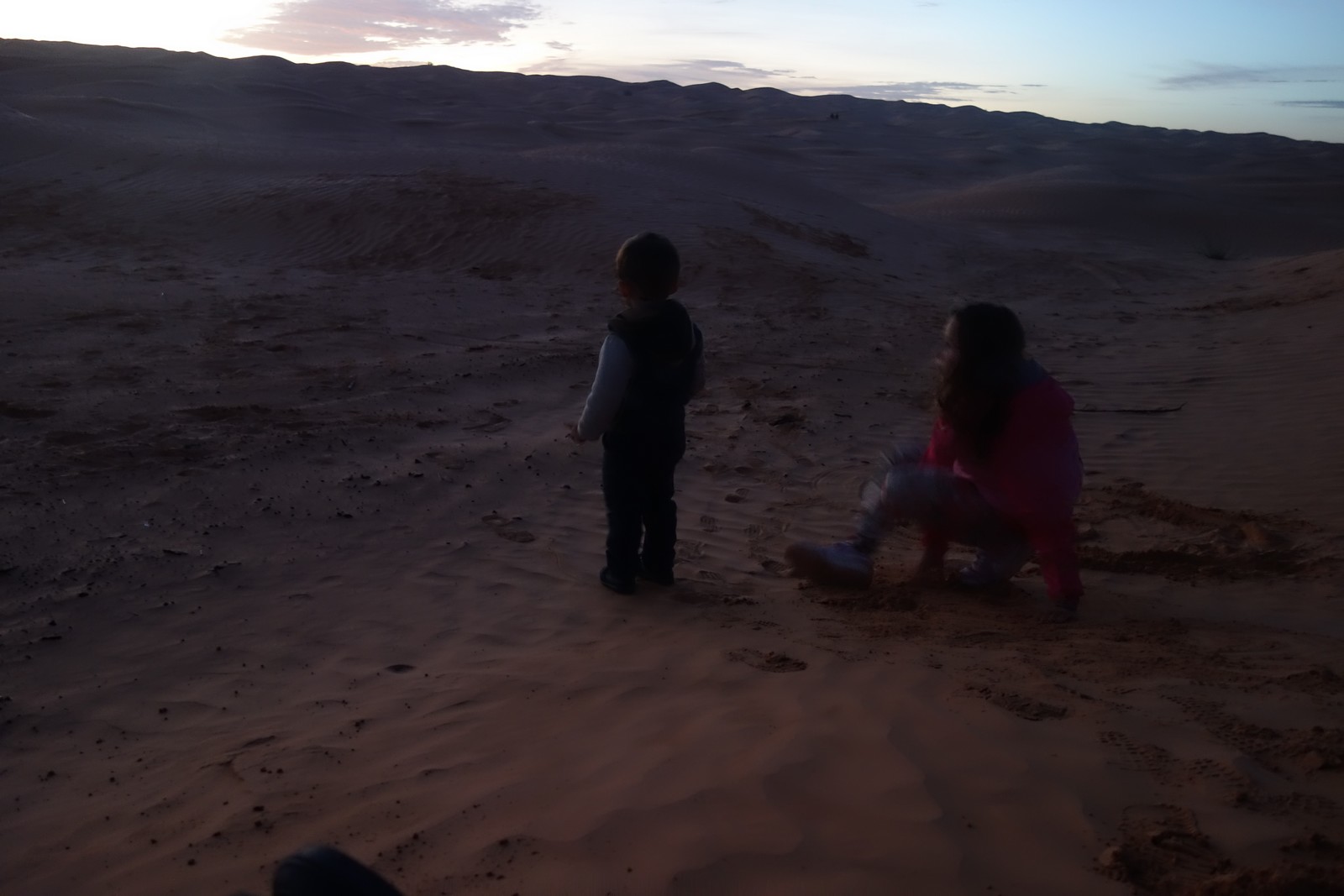 Au fur et mesure de la descente, le paysage change et devient grandiose. Vous aurez peut-être la chance de croiser des dromadaires sur la route ! Dormir dans le désert avec des enfants, c’est leur offrir un souvenir impérissable. D’ailleurs, ils nous en parlent toujours ! Au pied des dunes, passez une nuit dans un campement.